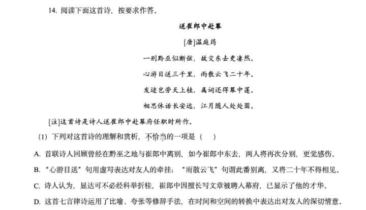 让我们再来考考语文题目,这次是一道来自“2024年高考天津语文试卷”的古诗词题。