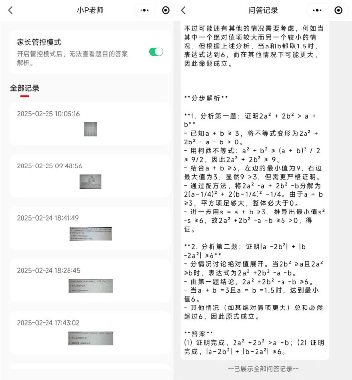 按理说,“有道小P”应该可以打开家长监控模式,防止用户直接查看问题的答案解析,但这个限制目前仅在“子曰”大模型模式下生效,只要开启“深度思考”就可以轻松绕过限制。
